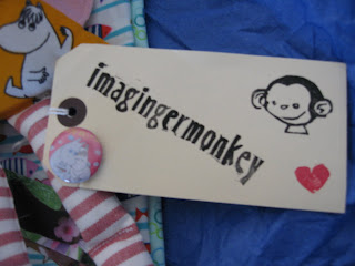 How great is she? I'm so excited. It's like all my birthdays and Christmas rolled into one. She has ginger hair and her stripy tights remind me of Jemima, the rag doll on Playschool that I always wished was mine! Yay!! She has 2 cute little Moomin button badges as well.
